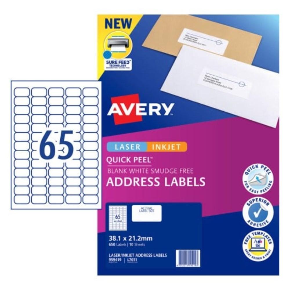 Avery Quick Peel Address Laser & Inkjet Labels White L7651 38.1 x 21mm 140 Labels
