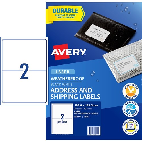 Avery Weatherproof Address & Shipping Laser White L7072 199.6 x 143.5mm 2UP 20 Labels