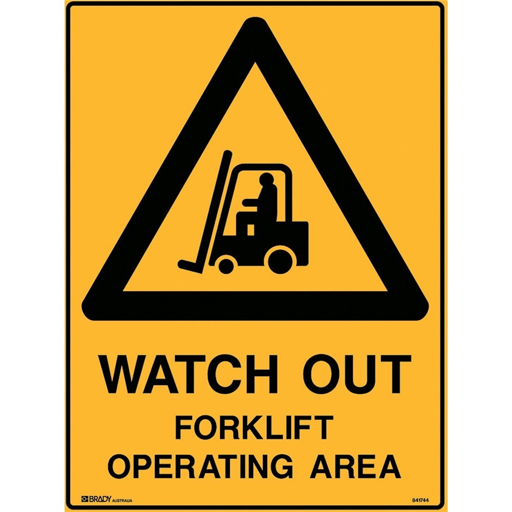 Brady Warning Safety Sign Watch Out Forklift Operating 450W x 600mmH Poly Yellow/Blk
